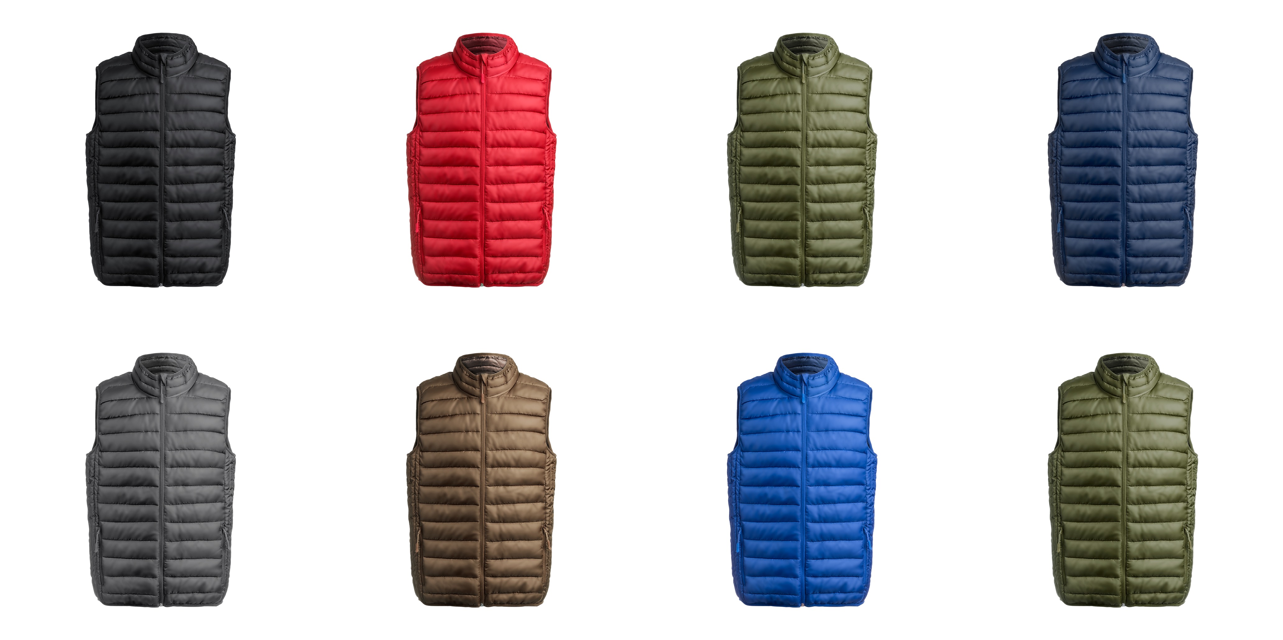 Vest in warm and soft 100% polyester material. In extra light, compact, waterproof and windproof material, with inner padding. Zip fastening with strap on puller and large side pockets. Zip collar with flap and side pockets with pull tabs. Includes handy carrying pouch.