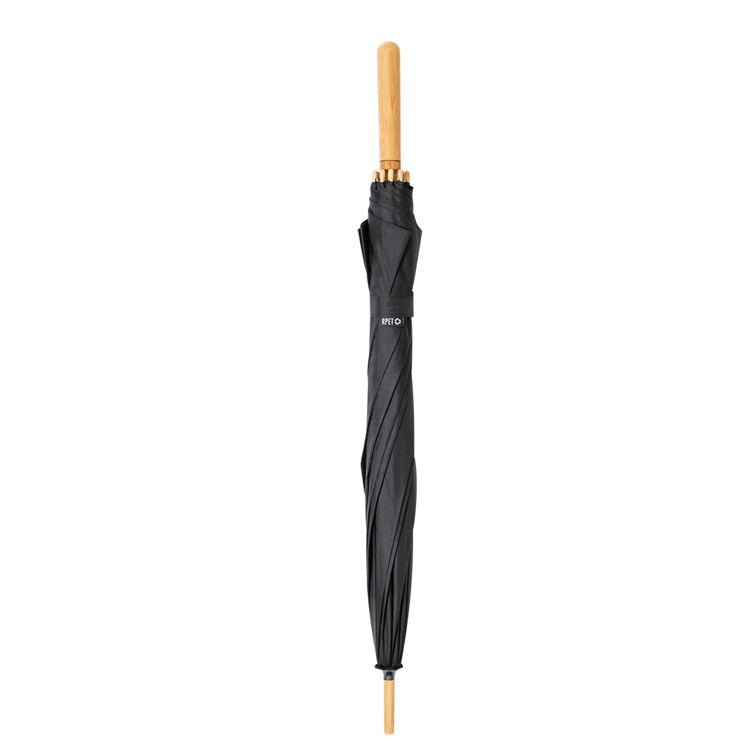 105cm diameter umbrella in 190T RPET pongee material. Manual opening and windproof mechanism, with fibreglass ribs an velcro closure. In an elegant bla colour, with straight handle made made in bamboo and RPET label.RPET material is made from recycled plastic, thus promoting the reuse of plastic waste and helping the sustainability of the planet.