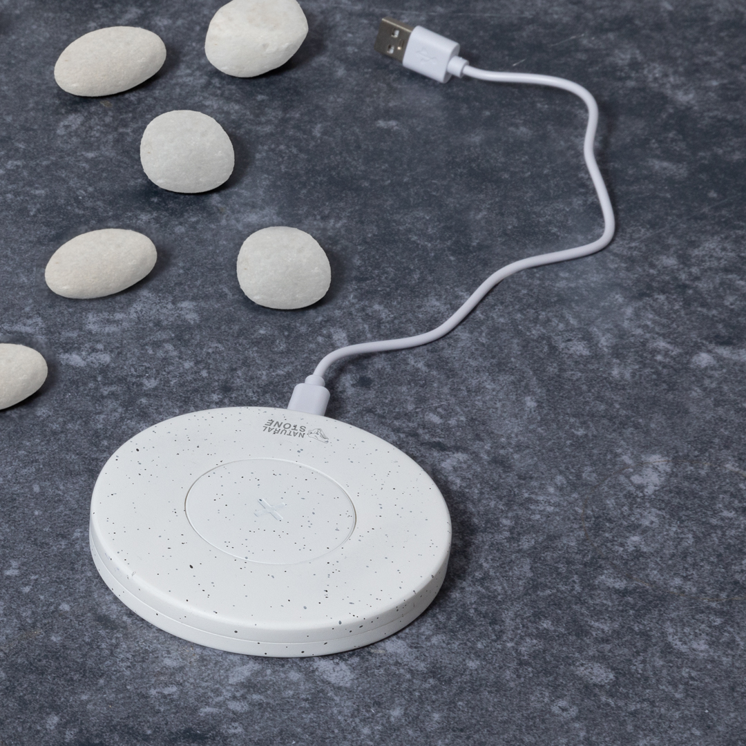Wireless circular charger 15W, made from natural stone extracts in combination with resistant ABS. Non-slip base and LED charging status indicator. Type C cable included and compatible with smartphones with wireless charging technology. Made from natural stone extracts, helping to reduce the use of plastics, as well as providing a smooth and resistant finish.Manufactured according to RoHS standards and in compliance with the following safety requirements: Overheating protection system. Over-charge protection system. Blocking system to prevent short circuits.