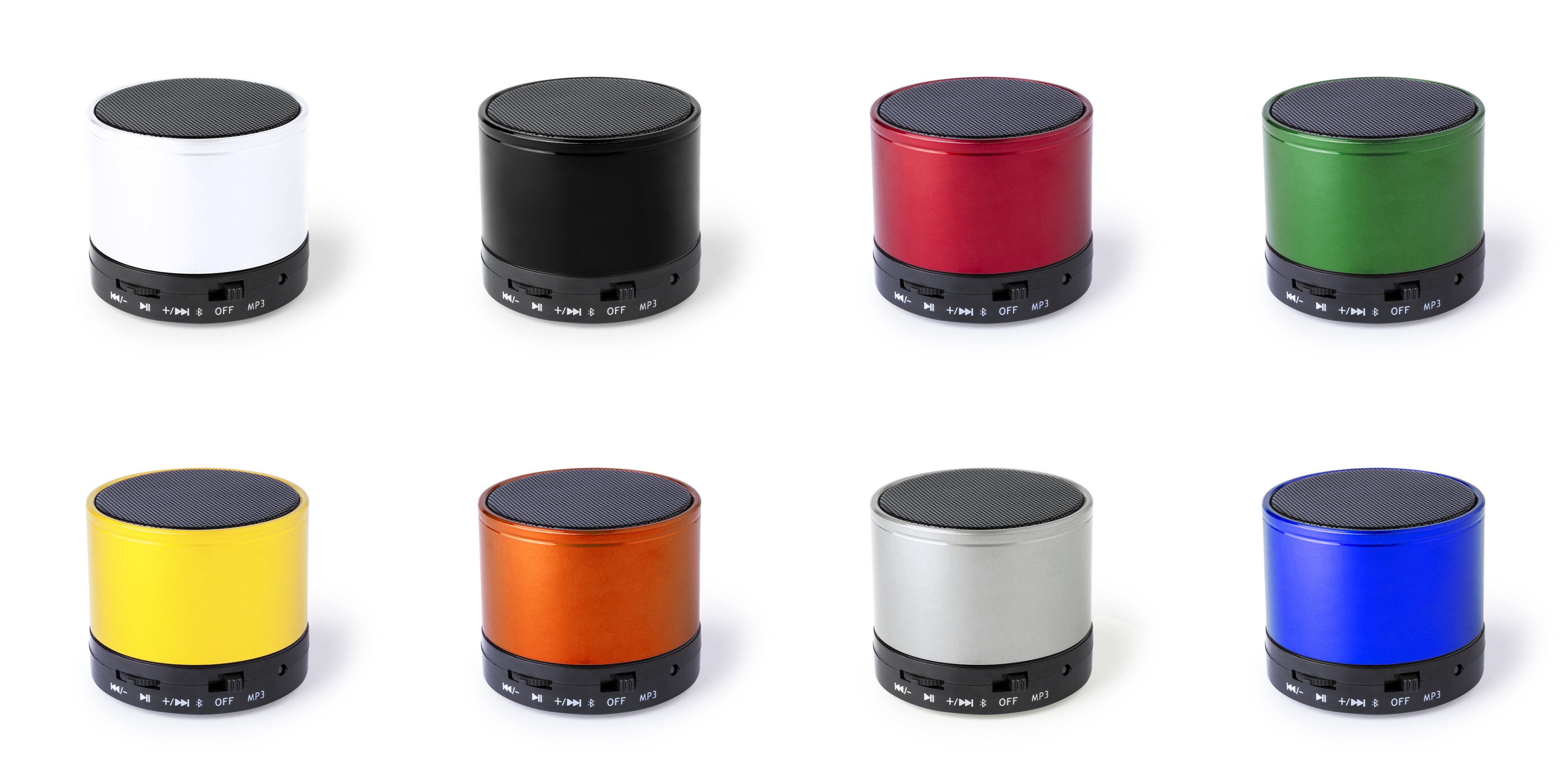 Compact speaker with Bluetooth® 5.0 connection AND 3W power. Hands-free function, slot for mini SD cards up to 64 GB capacity, FM radio function, and Aux-in via 3.5 mm jack connection. With non-slip rubber pads on the base. Compatible with iOS and Android, includes charging cable and 3.5mm jack AUX cable. Presented in an attractive design box, with instruction manual in English and Spanish. Available in a wide range of metallic colours.