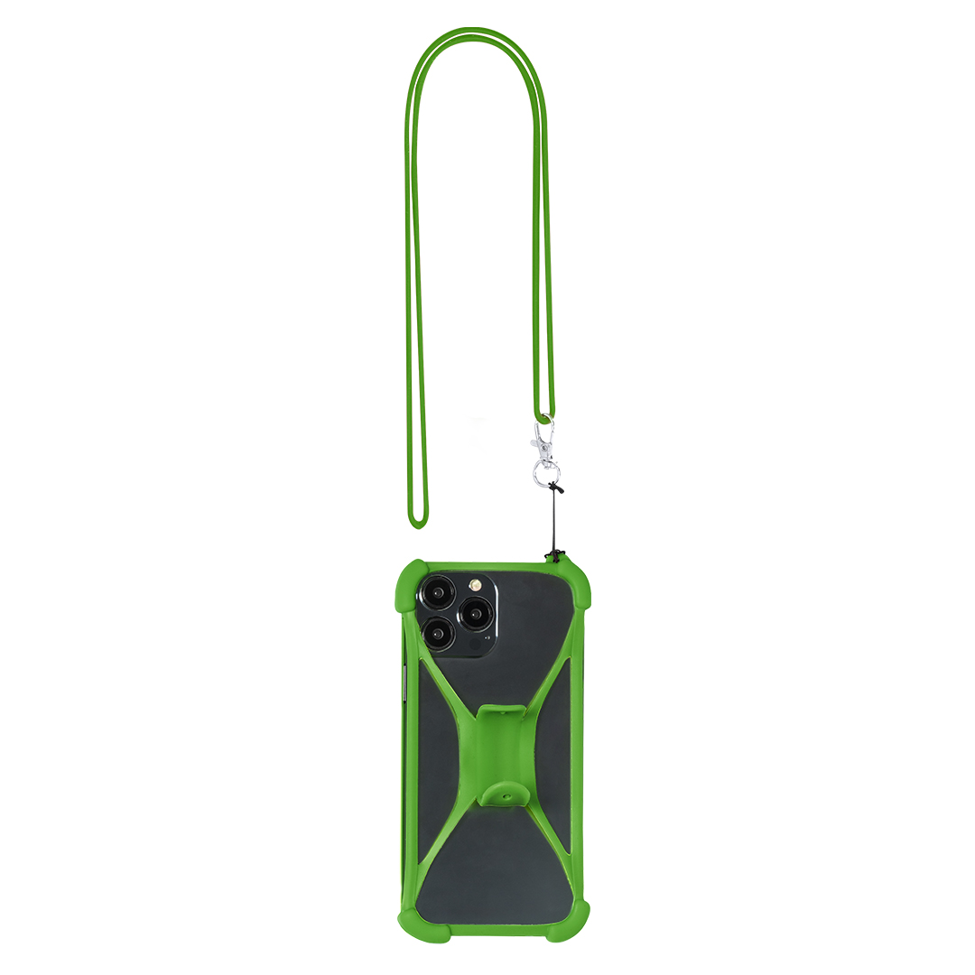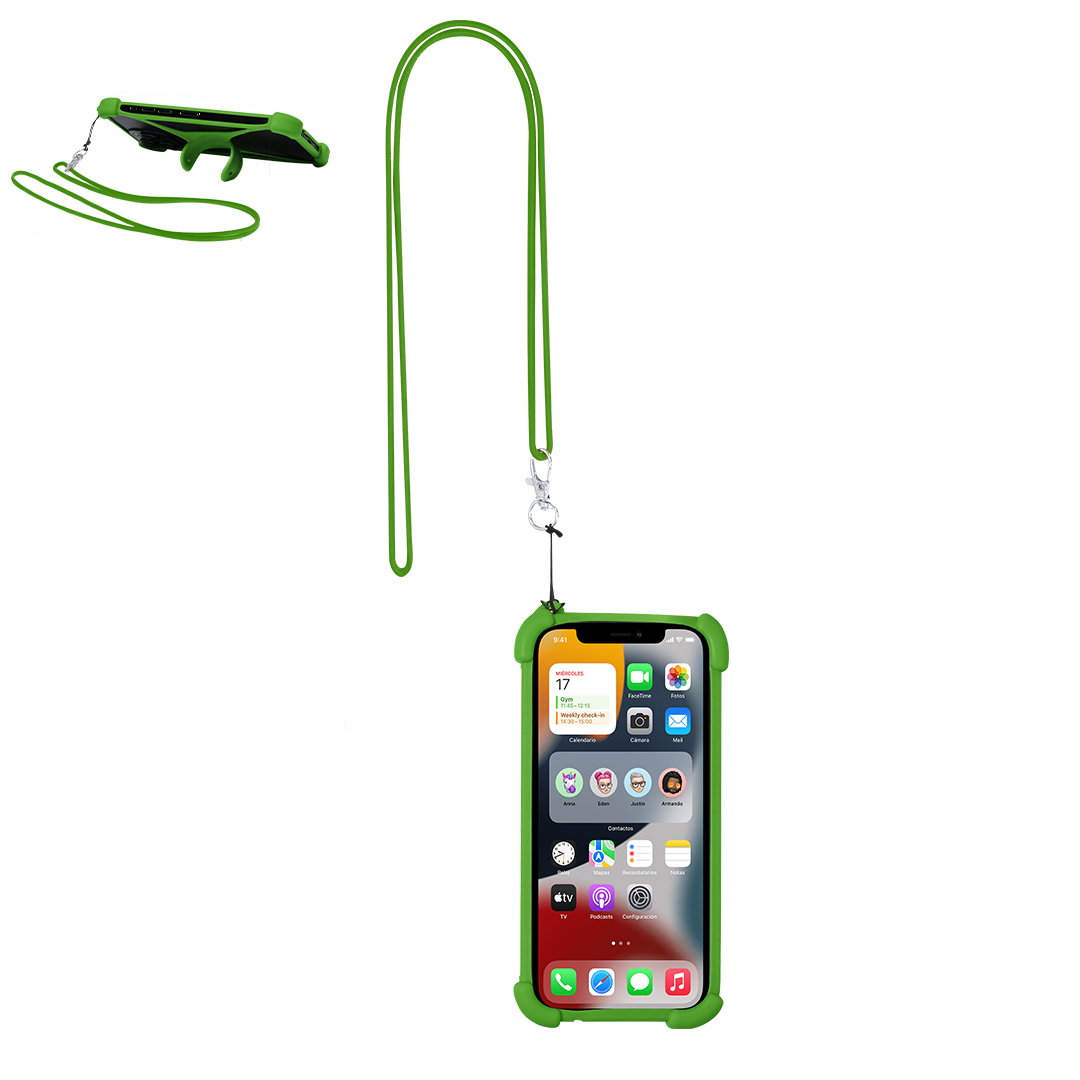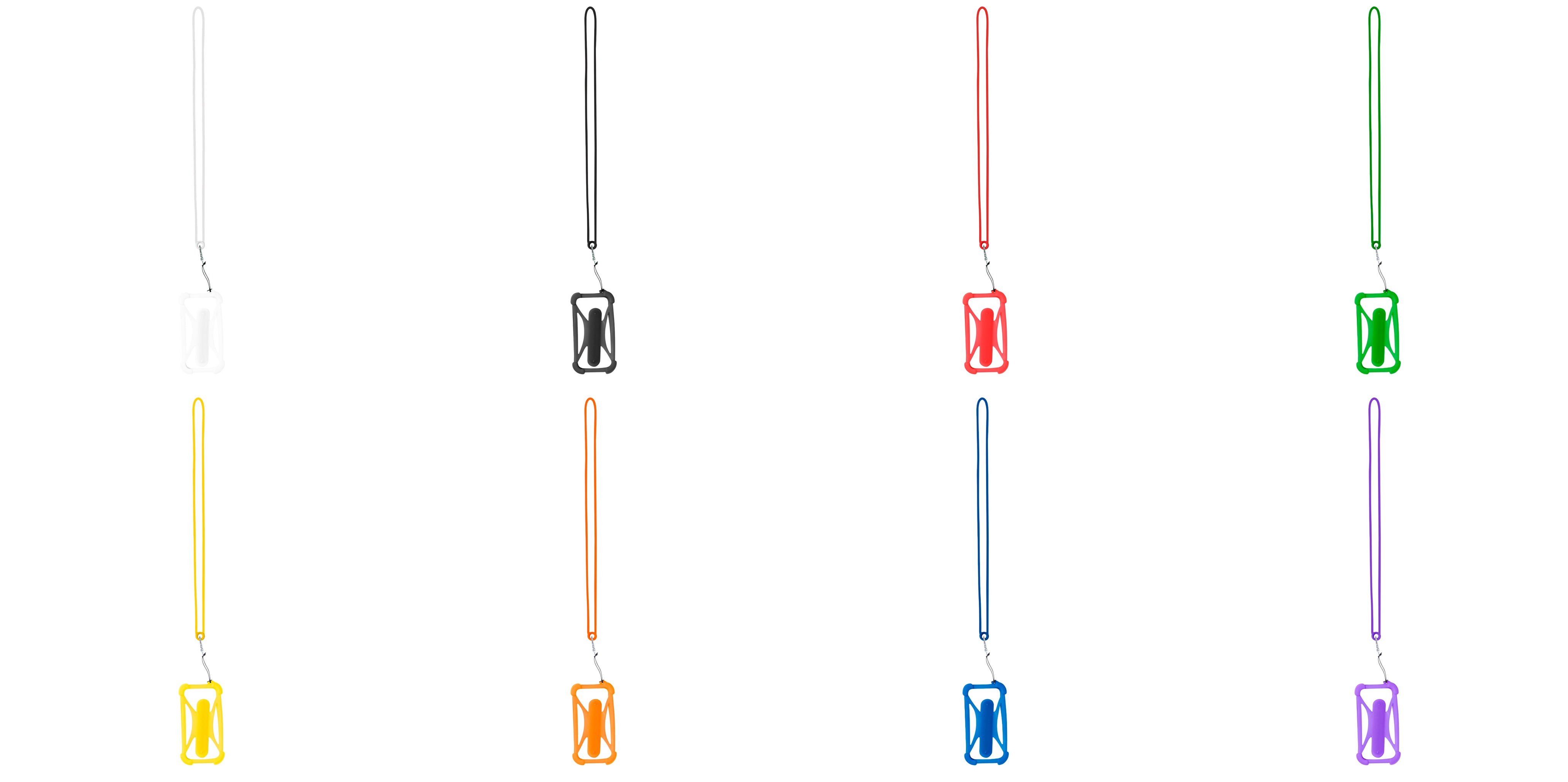 Practical lanyard made of resistant silicone. Includes a matching mobile phone accessory, reinforced at the corners and with a fold-out holder at the back. With metal swivel carabiner and available in a wide range of colours.