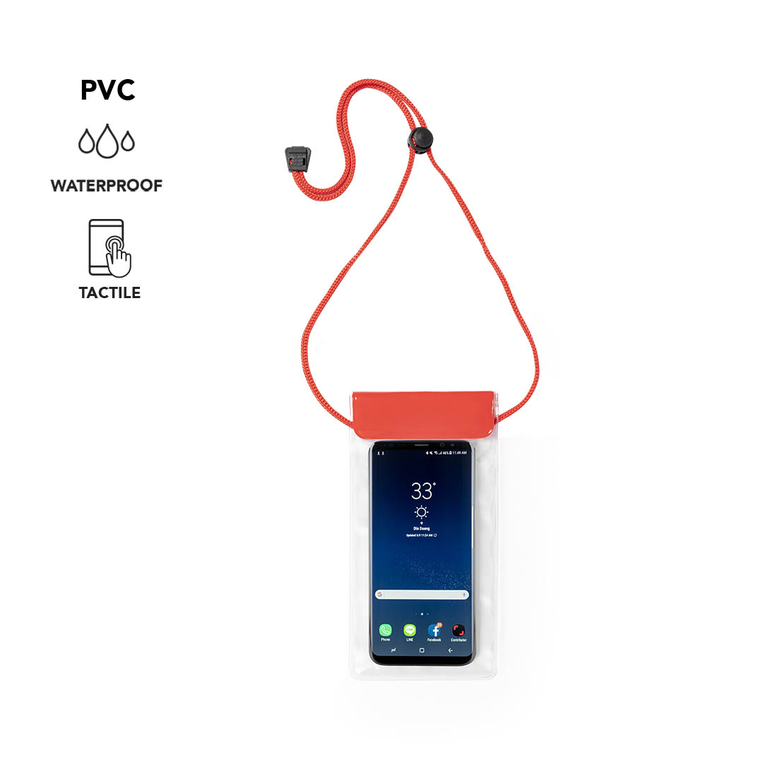 Handy, waterproof PVC case with touch function and double security system for watertightness. Specially designed for devices with 6.5" screen. With matching drawstring, adjustment accessory and large branding surface.