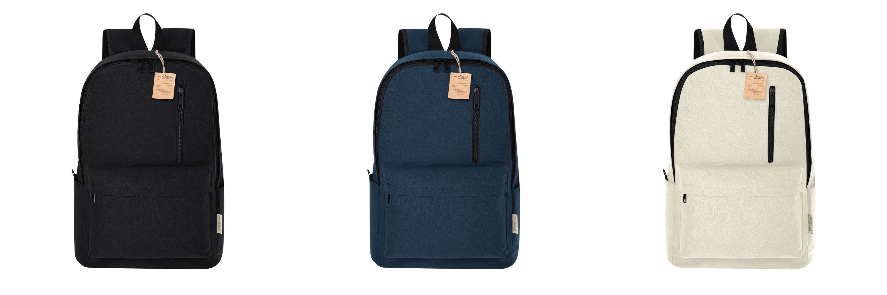 Backpack made primarily from soft recycled cotton. With a main pocket with double pull zipper closure. Interior pocket for laptops up to 15 inches. Includes two front pockets with zipper closures and side pockets. Padded back and straps, with breathable fabric and adjustable. Includes strap for trolley or suitcase adjustment, ideal for travel. With distinguishing label on the outside, as well as a distinctive hashtag.